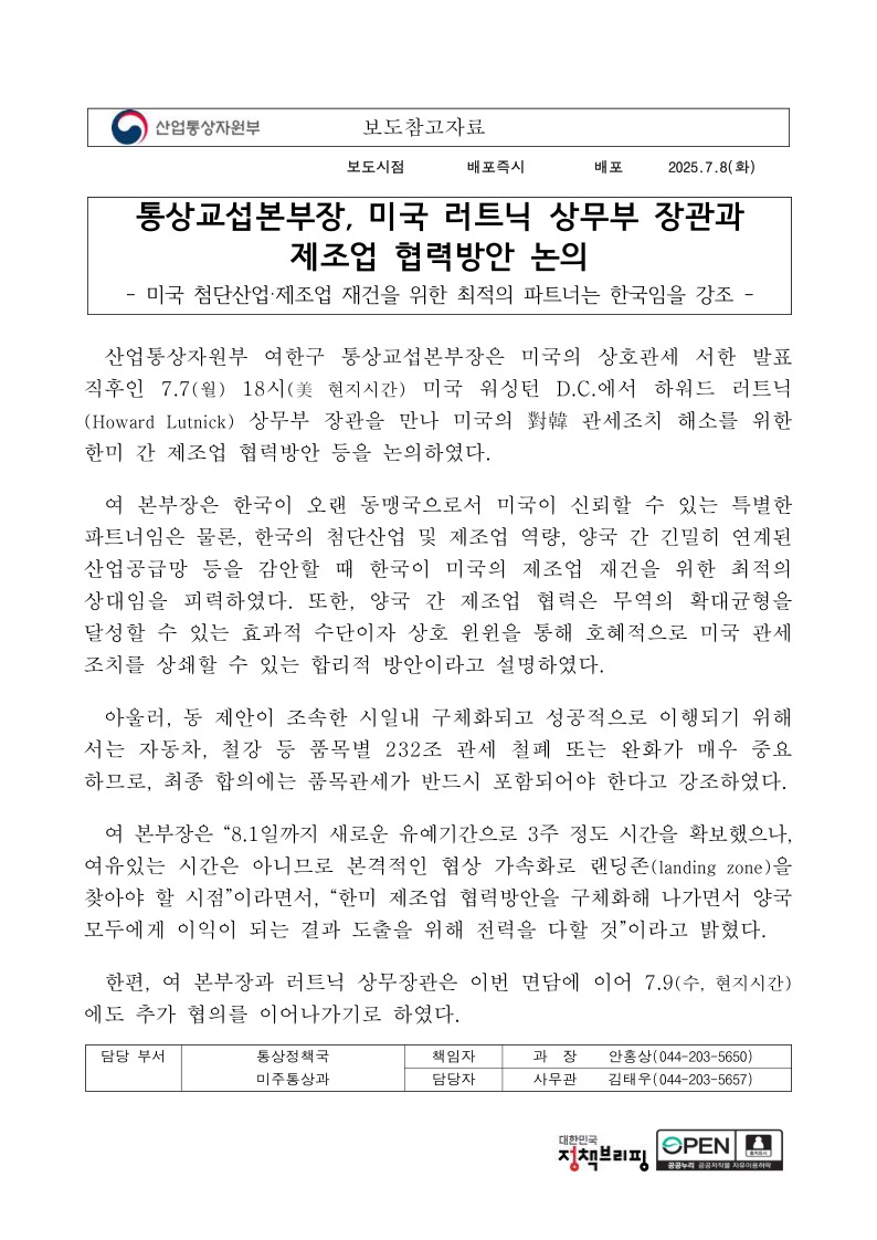 참고자료미주통상과, 통상교섭본부장, 미국 러트닉 상무부 장관과 제조업 협력방안 논의.pdf (127.3K)